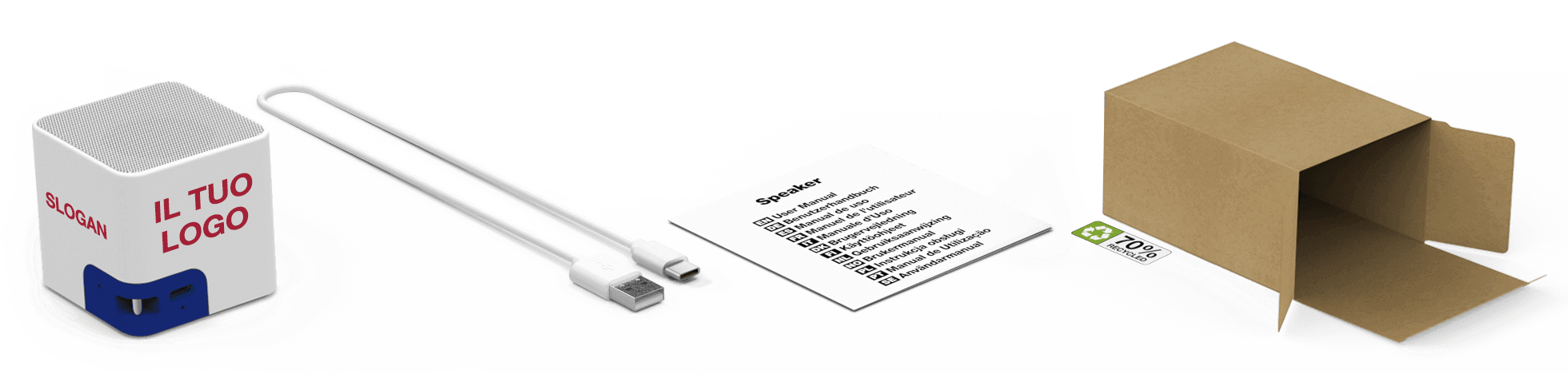 Il nome Bluetooth® verrà visionato sul dispositivo smartphone o tablet quando accoppiato al prodotto Audio. Possiamo personalizzarlo con il vostro marchio aziendale in modo tale da esporre ancora di più il brand. Se non si desidera questo servizio, verrà assegnato al prodotto il nome predefinito 'Promo Audio'.Accessori