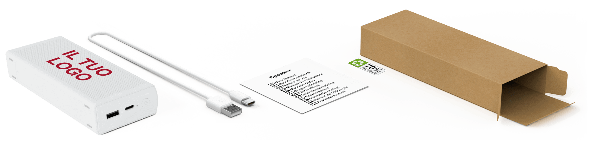 Il nome Bluetooth® verrà visionato sul dispositivo smartphone o tablet quando accoppiato al prodotto Audio. Possiamo personalizzarlo con il vostro marchio aziendale in modo tale da esporre ancora di più il brand. Se non si desidera questo servizio, verrà assegnato al prodotto il nome predefinito 'Promo Audio'.Accessori