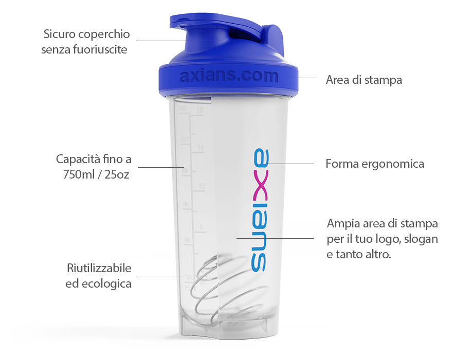 Realizzata in plastica robusta e priva di BPA, questa bottiglia shaker personalizzabile promette sicurezza e durata. È dotata di una sfera shaker in acciaio inossidabile progettata per mescolare senza fatica frullati proteici o qualsiasi integratore sportivo e di un coperchio flip-top per sorseggiare senza problemi anche in movimento. Disponibile nei formati da 550 e 750 ml, è la soluzione perfetta per uffici, palestre e qualsiasi altro luogo!