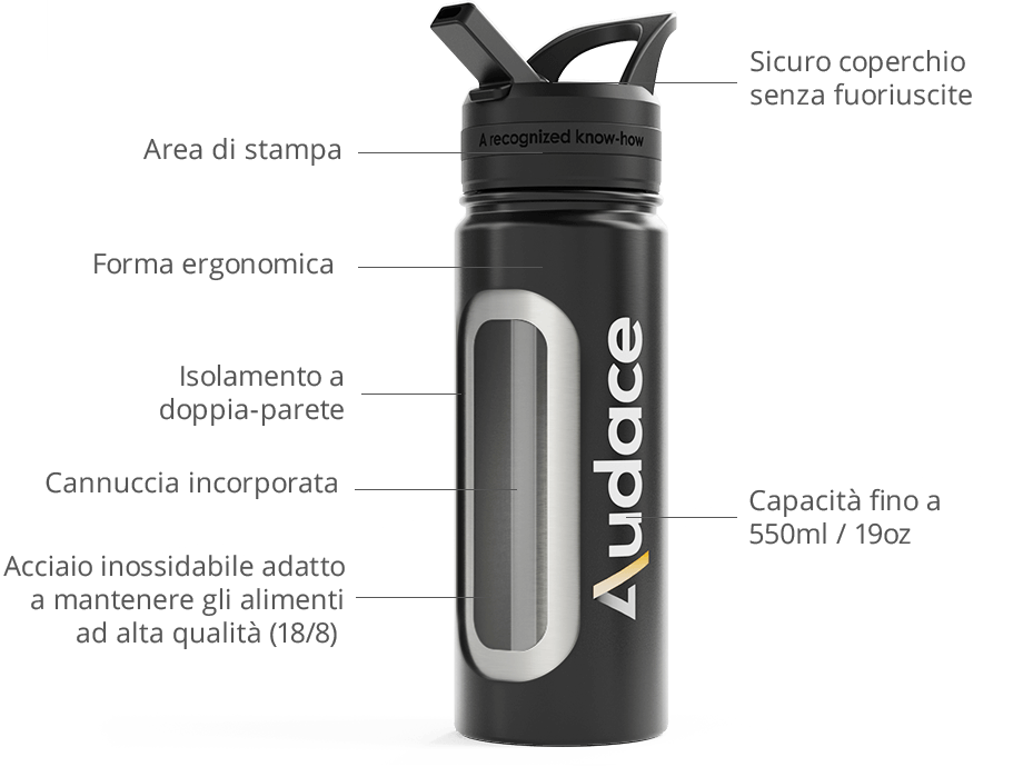 Il modello Range è dotato di un pratico cinturino per il trasporto, di una cannuccia integrata e isolamento a doppia parete per mantenere la temperatura della bevanda più a lungo. Anche il beccuccio ergonomico è molto apprezzato tra gli utilizzatori. Contattaci oggi per informazioni su prezzi, tempi di consegna, opzioni di stampa e l'invio di campioni fisici.