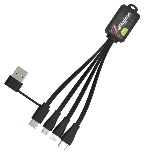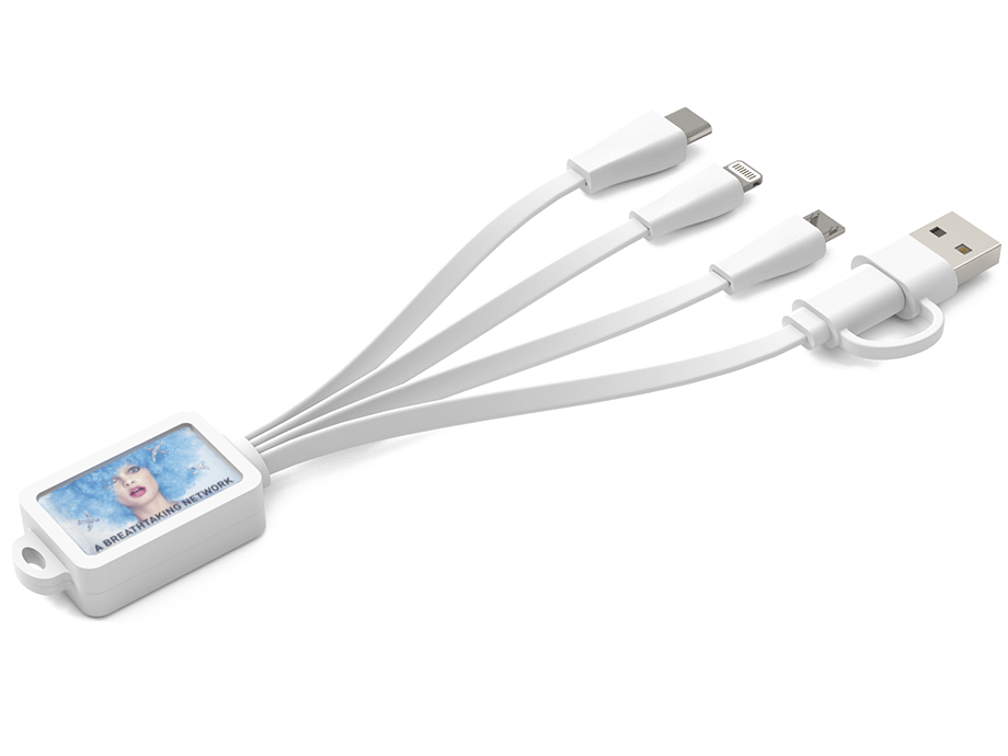 Il modello Multi combina 4 cavi in un unico e pratico prodotto. I tuoi clienti potranno inserire il connettore USB standard in una presa a muro o computer e caricare fino a 3 dispositivi attraverso l'adattatore Lightning, il connettore USB-C e il connettore Micro-USB. Il modello Multi può essere agganciato ad un mazzo di chiavi e presenta un'ampia superficie da stampare in digitale con la tua immagine, logo, sito internet o slogan. Per una finitura in legno, date un'occhiata al nostro modello .