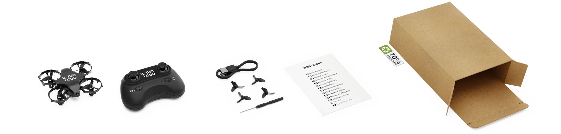 Con 3 aree dedicate al branding sull'unità del drone stesso e un'ulteriore ampia area di branding sul controller, il vostro logo e il vostro messaggio saranno ben visibili durante il volo e a terra.