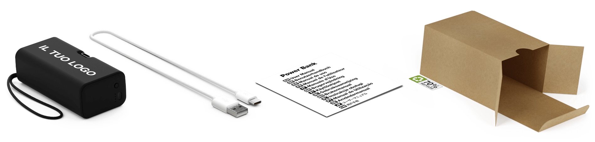 L'Amp Power Bank è un prodotto promozionale funzionale e maneggevole che verrà utilizzato quotidianamente, garantendo una fantastica esposizione del marchio. Questo modello è dotato di un connettore USB-C integrato per ricaricare i dispositivi USB-C e di una porta USB-C che consente di collegare e ricaricare altri dispositivi a piacimento. L'Amp è dotato anche di un'utile torcia, di pratico laccetto e di indicatori LED per il livello della batteria.