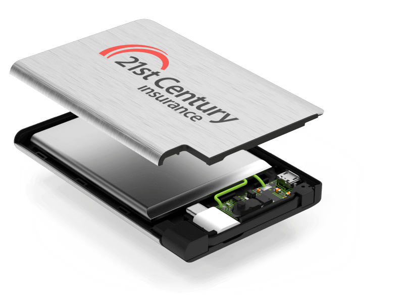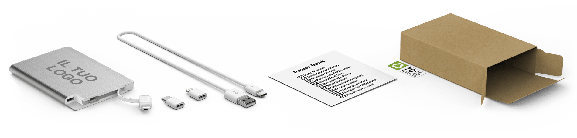 Entrambi i lati del nostro Power Bank Volt possono essere stampati o incisi a laser con il tuo logo, slogan, sito internet, dettagli dell'evento o altro. Con il suo cavo Micro-USB integrato, un adattatore Lightning e USB-C, il modello Volt è il compagno perfetto per lo smartphone o tablet dei tuoi clienti.